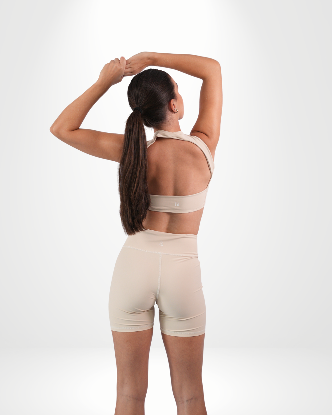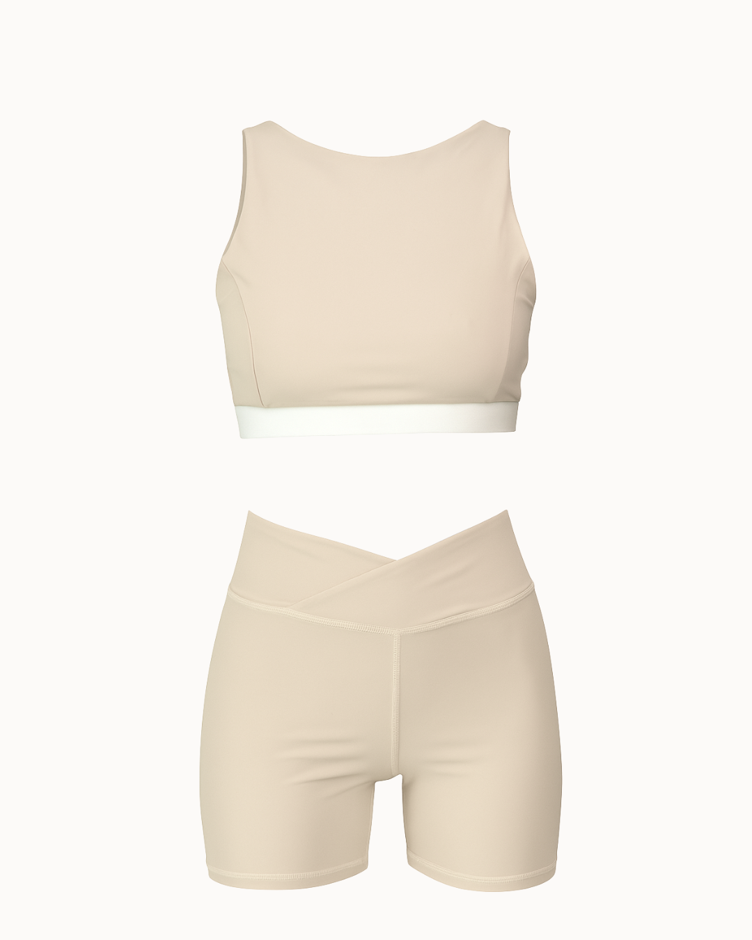 This beige workout set combines style and comfort for any type of training. The high-rise crossover waistband gives a secure, flattering fit and extra support around the waist, so you feel confident and comfortable through every move.