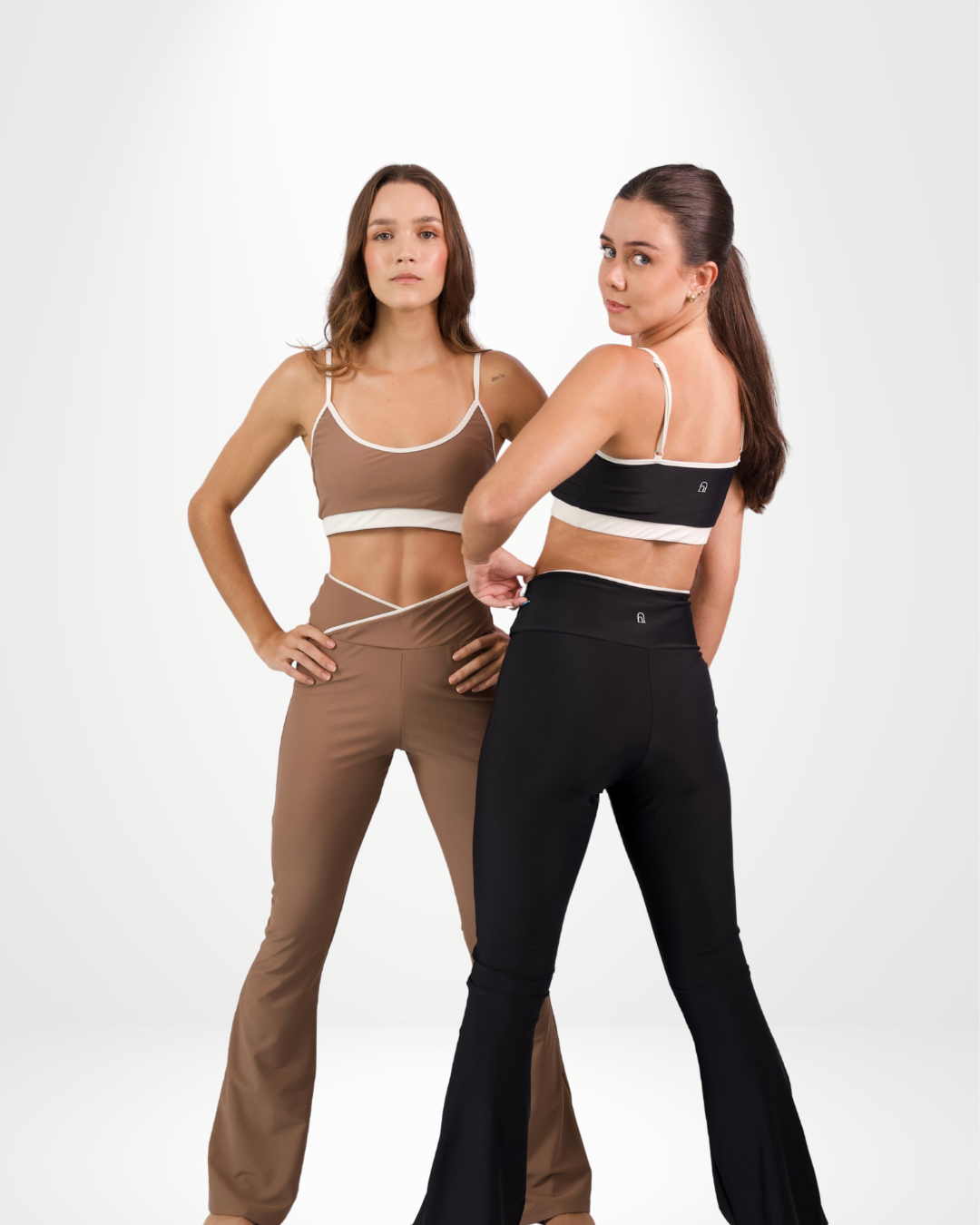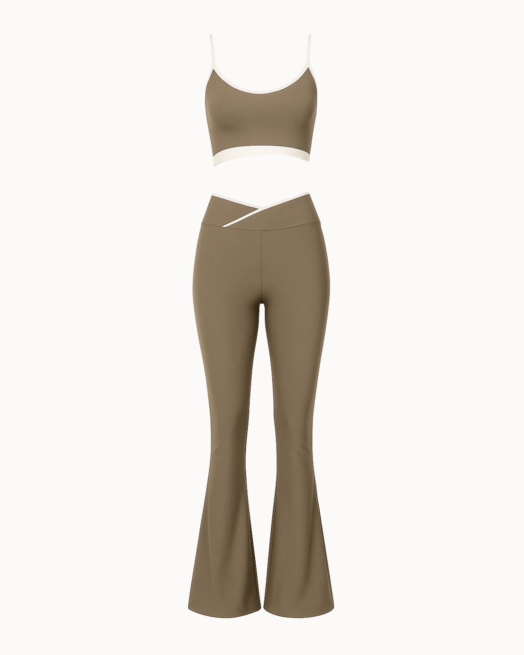 This sleek mocha set with ivory trim flatters your figure and adds a modern edge with its crossover waistband. Perfect for workouts, errands, or casual outings—style meets comfort in one versatile piece.
